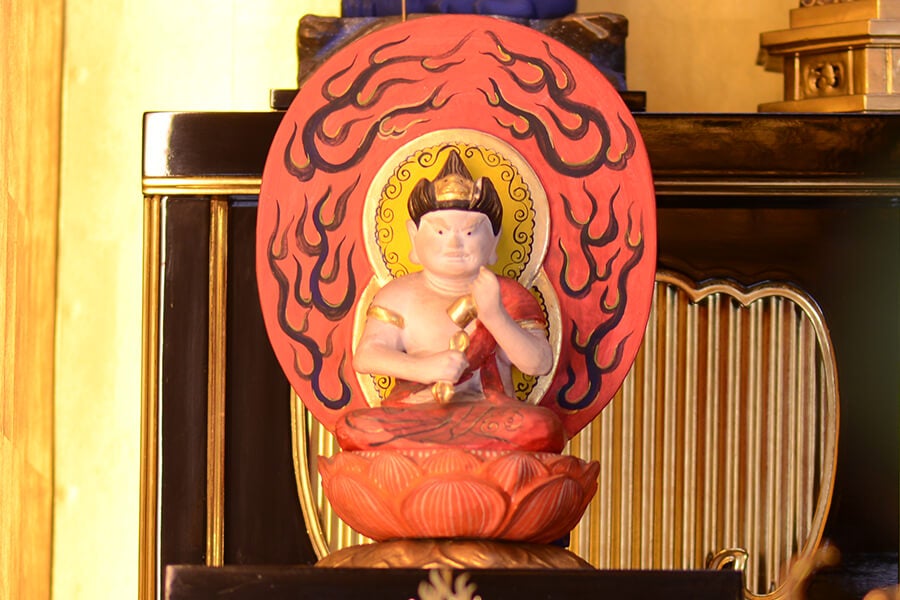 本光寺には、「縁結び守護愛染明王」が勧請されており、縁結びや愛の神として守護しています。「縁結び守護愛染明王」は、愛情・情欲をつかさどり、愛欲貪染をそのまま浄菩提心(悟りの心)にかえる力をもち、煩悩即菩提を象徴している明王です。その身色は真紅であり、後背に日輪を背負っています。
